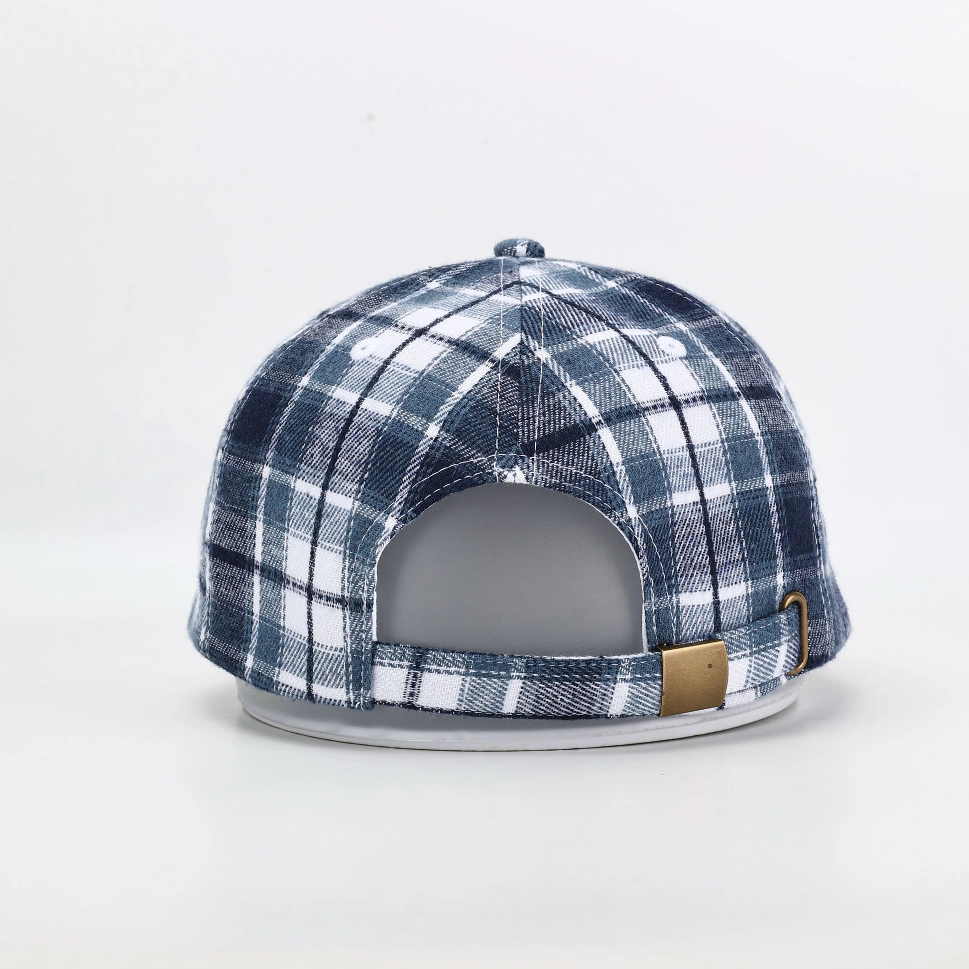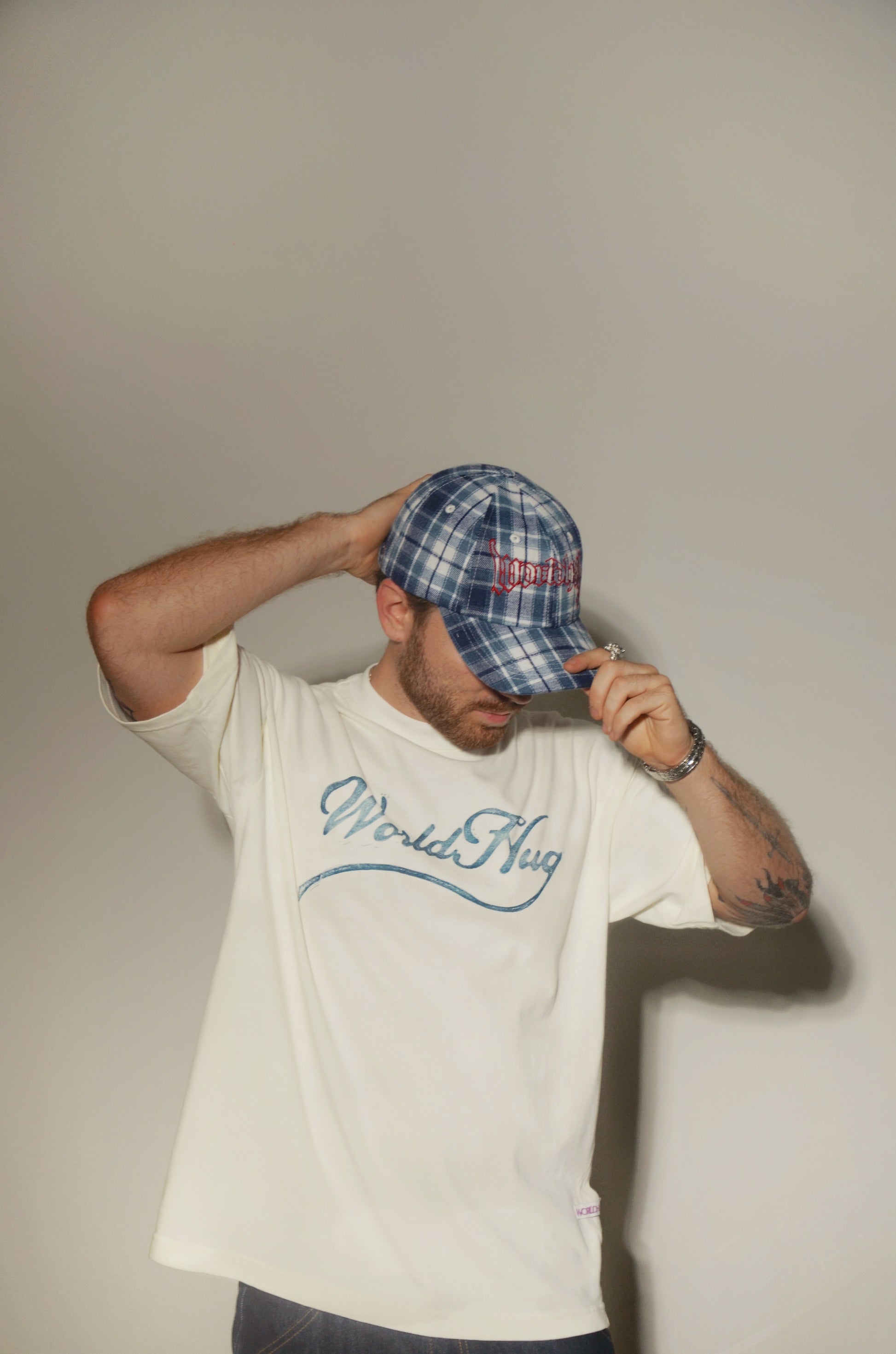Fully blue and white plaid 6-panel baseball cap with red gothic World Hug logo embroidery.